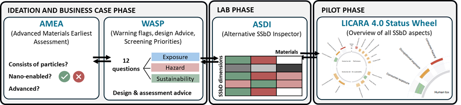 - In de pilotfase: gebruik LICARA nanoSCAN 4.0 voor interactieve visualisatie van de verschillende SSbD aspecten, samen met meer gedetailleerde methodes en voorspellende tools.
